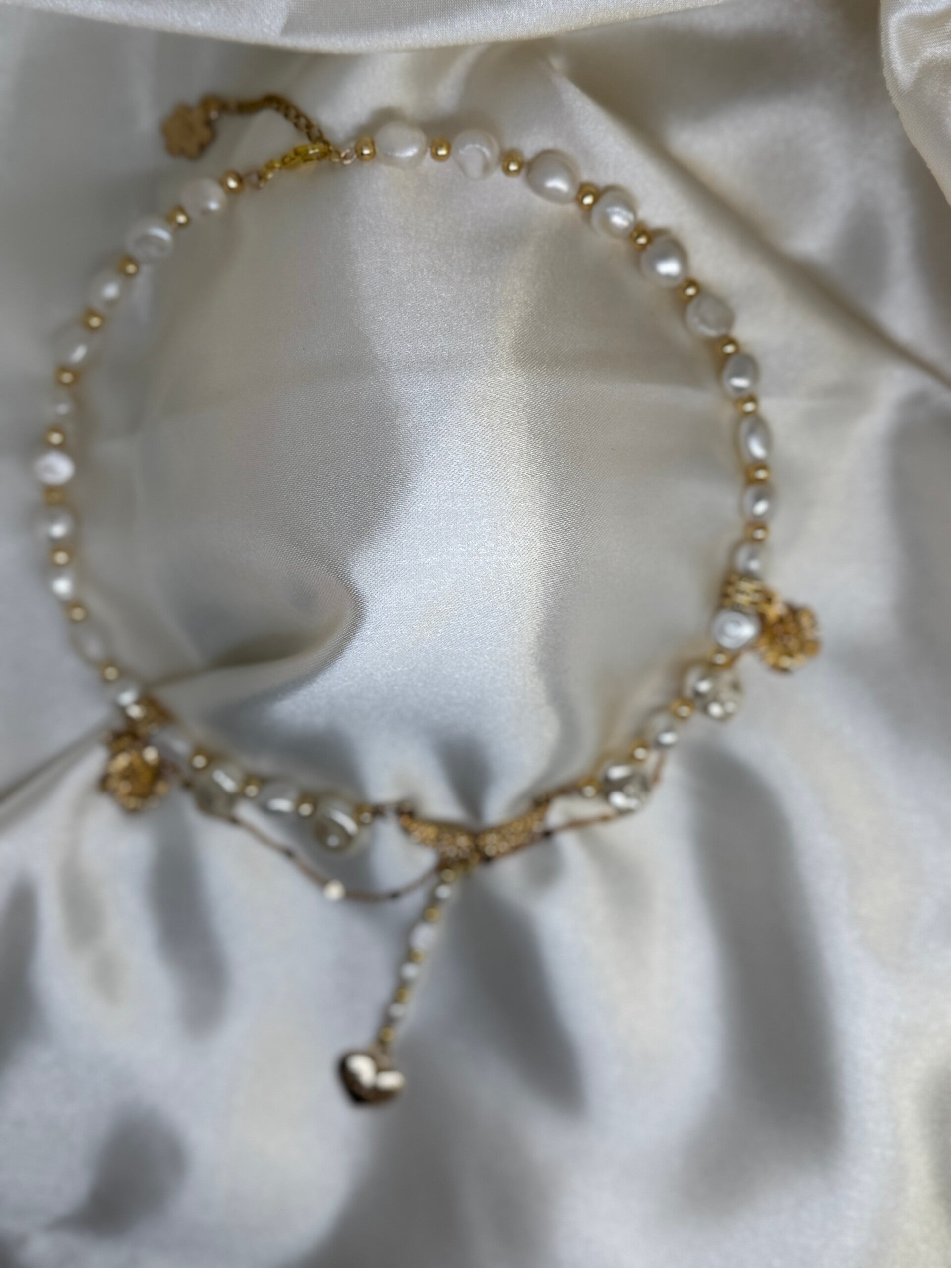 Sanft schimmernde Perlen in organischer Form treffen auf feine 14 K vergoldete Elemente, einen zarten Herzanhänger und filigrane Engelsflügel.